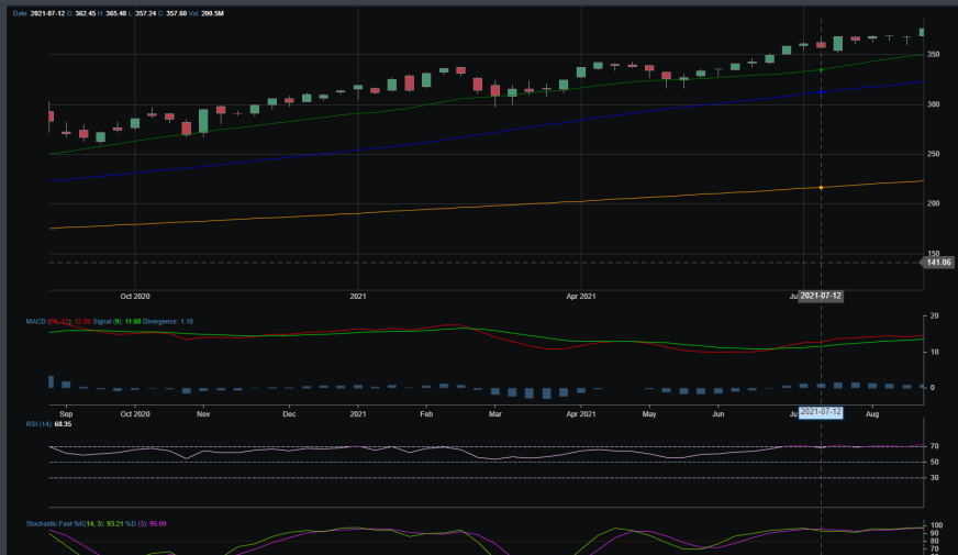SPY has been a solid performer for all of 2021. It is well above its 20, 50, and 200 DMA support line. Though the technical readings suggest SPY is overbought on the weekly chart, SPY has plenty of room to run.