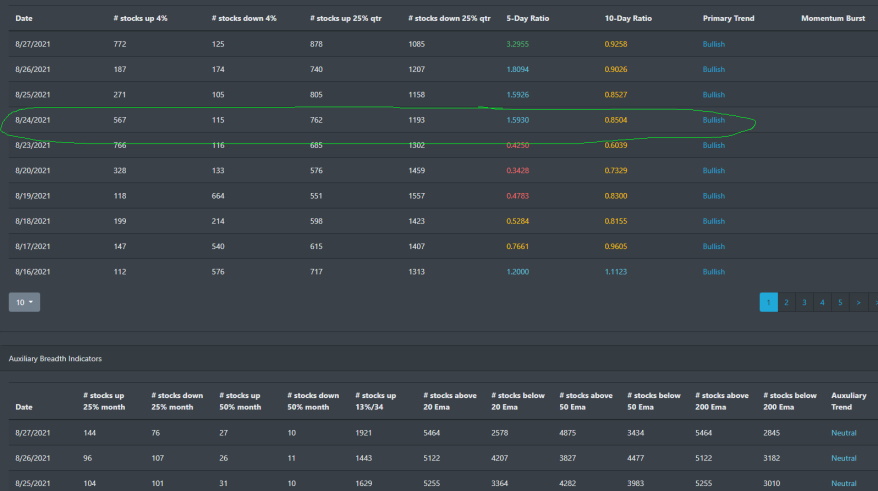 Market breadth was oscillating in bearish reading for most of July and August. On August 24, there was a strong push by market participants to propel the 5-day to 10-day ratio bullish crossover. If this momentum continues, stocks up 25% to 25% down are looking to crossover as well. Also, notice that stocks above their 200 EMA pushed higher as well.