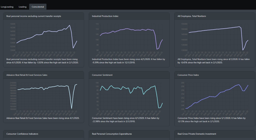 What is most interesting is the coincidental indicators. Looking over at the real personal income data, you can see that starting in May 2020, it rose after a disastrous fall to historical lows. This rise is most likely attributed to the stimulus package and the $600 a week unemployment benefits. What will this reading look like in the next month or two as Congress works out what the next stimulus package will cover? While both Republicans and Democrats try to agree on what the next additional relief for business and consumers, the retail space, industrial production, and consumer sentiment are moving in an up-trend. Advance Retail and Food services are back at pre-pandemic levels. Take a look at 2 consumer ETFs and you will see that a V-shape recovery is currently underway. XLP and XLY.